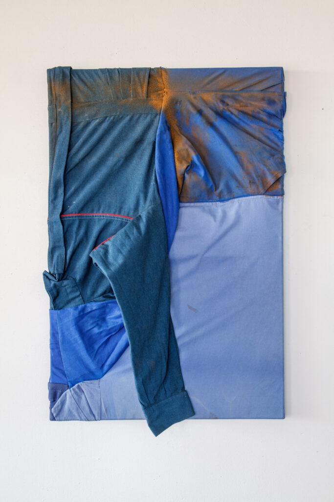 In the “Blue Collar” (Bleus de Travail) series, used work wear is sewn together to produce abstract compositions (2022). The worn overalls, jackets, jumpsuits, pants come from an earlier public art installation, Ocnus’ Rope, commissioned by the City of Saint-Chamond in 2020. The work clothing is cut and machine stitched together into intuitive, abstract forms that are then adhered to wooden stretcher bars. Some of the works have stains and paint splotches, signs of physical wear and tear on the former garments. Other have been more recently rust dyed, painted with rust from steel in strategic areas in 2025.